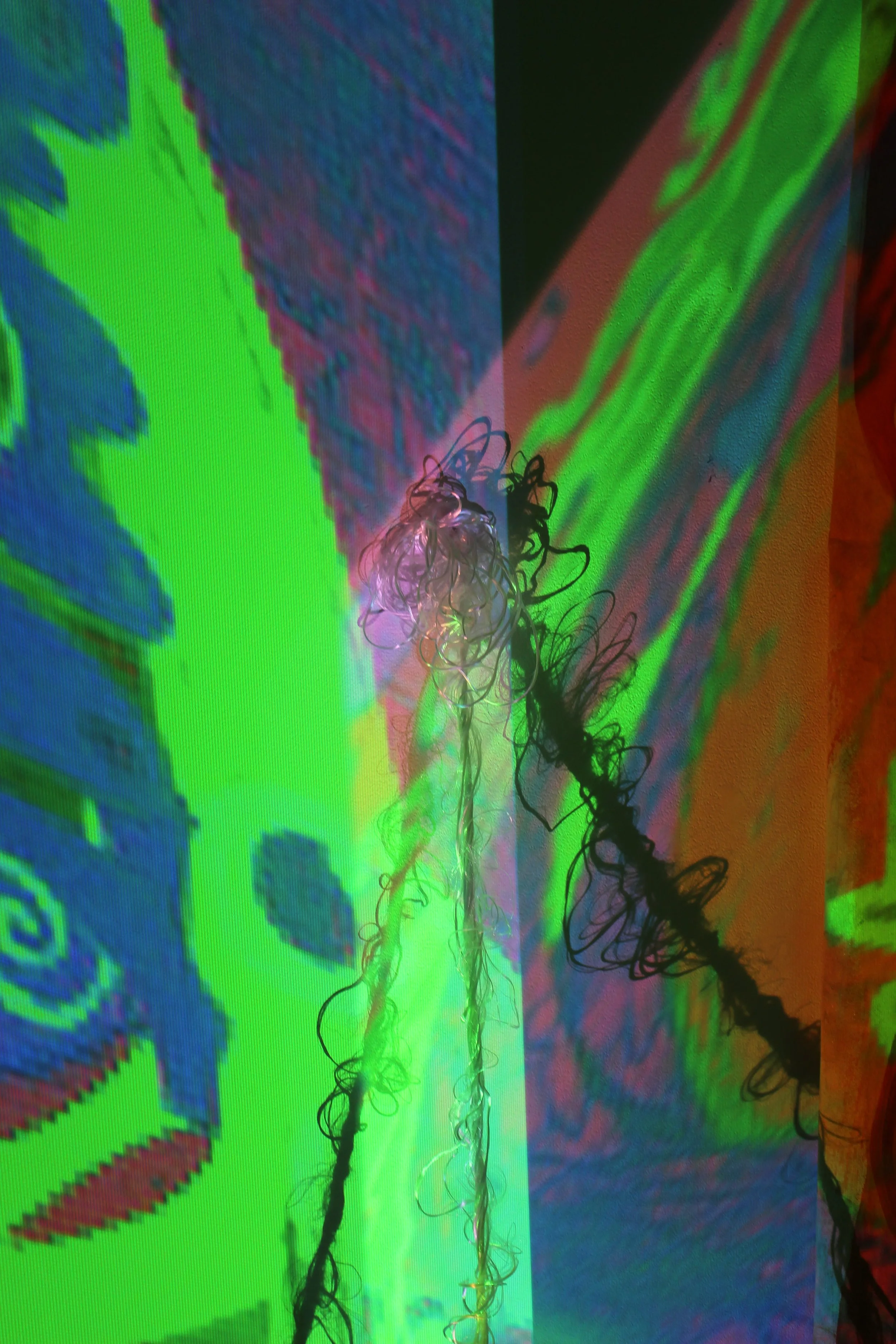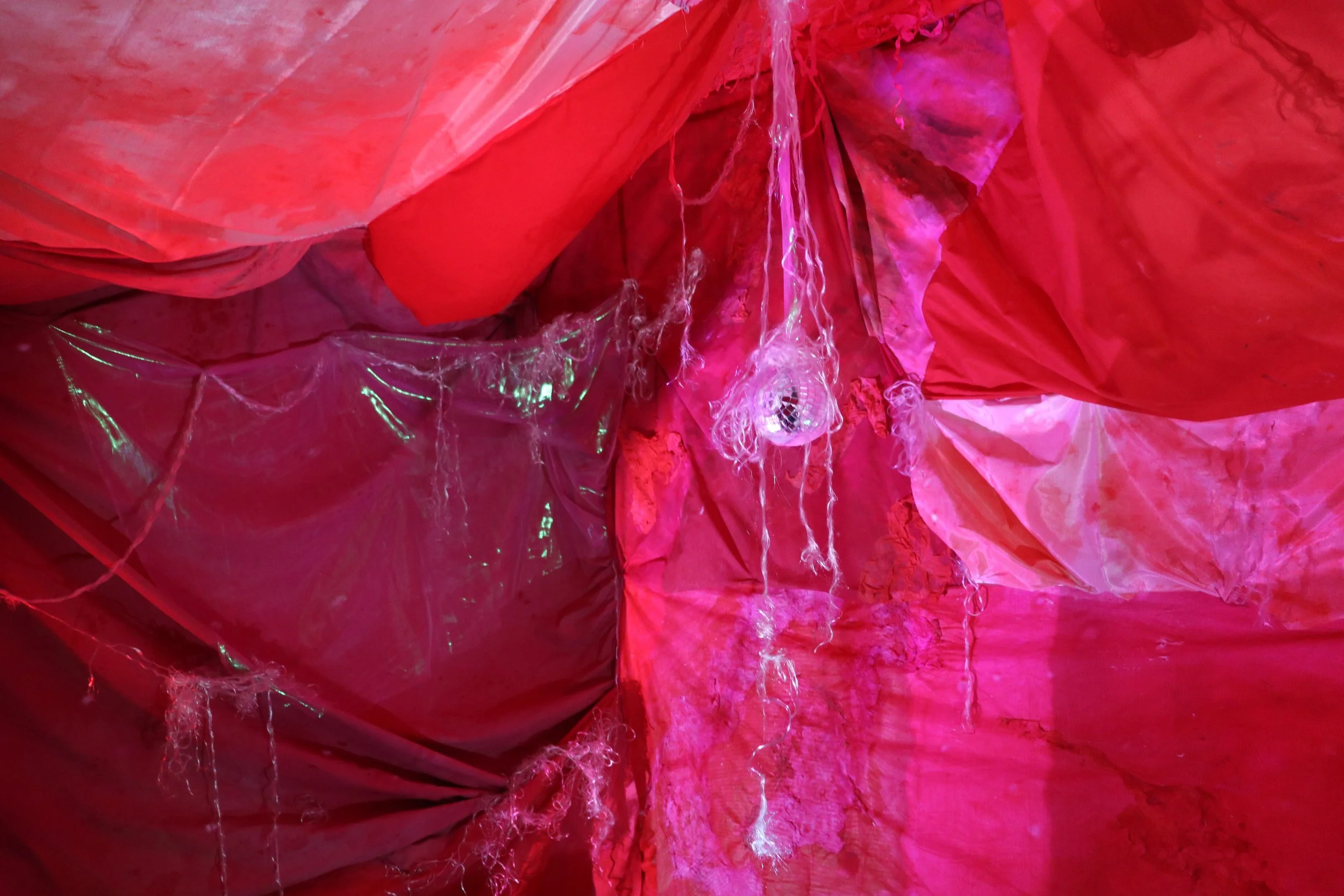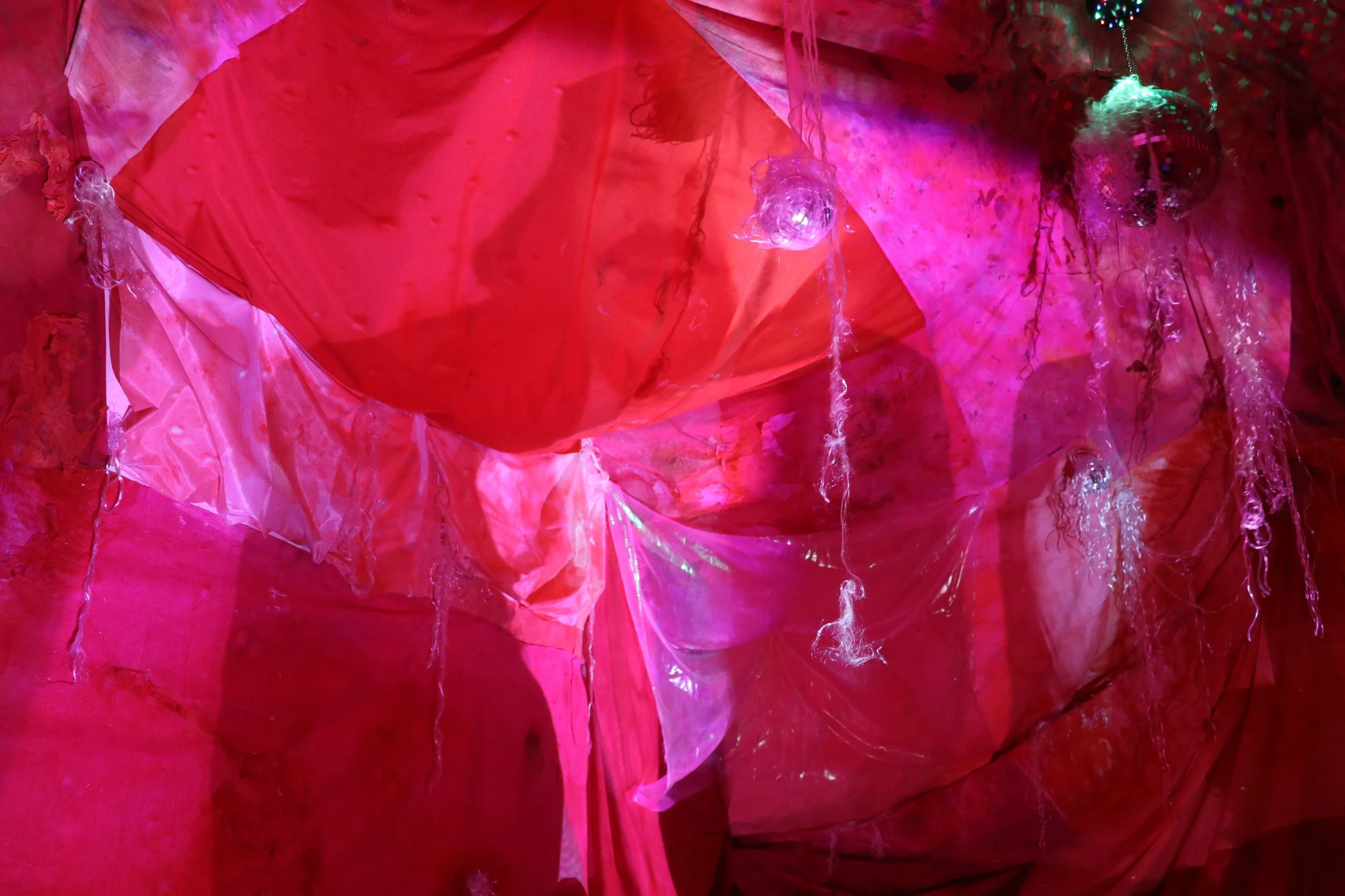 Fetus Dance Party in the Womb Room (2021) is an interactive multimedia installation that combines video, sound, light, textiles and mixed media. The installation presents the womb as a grotesque psychedelic dreamscape, situated between the absurd realm of disco and abject experiences of womanhood. Viewers are encouraged to embrace feminist art and critique to re-imagine the representation and value of female experience for a hopeful futurity.
