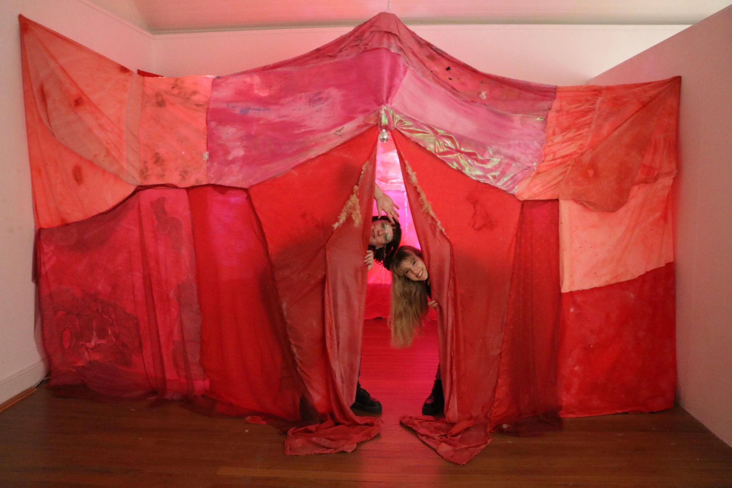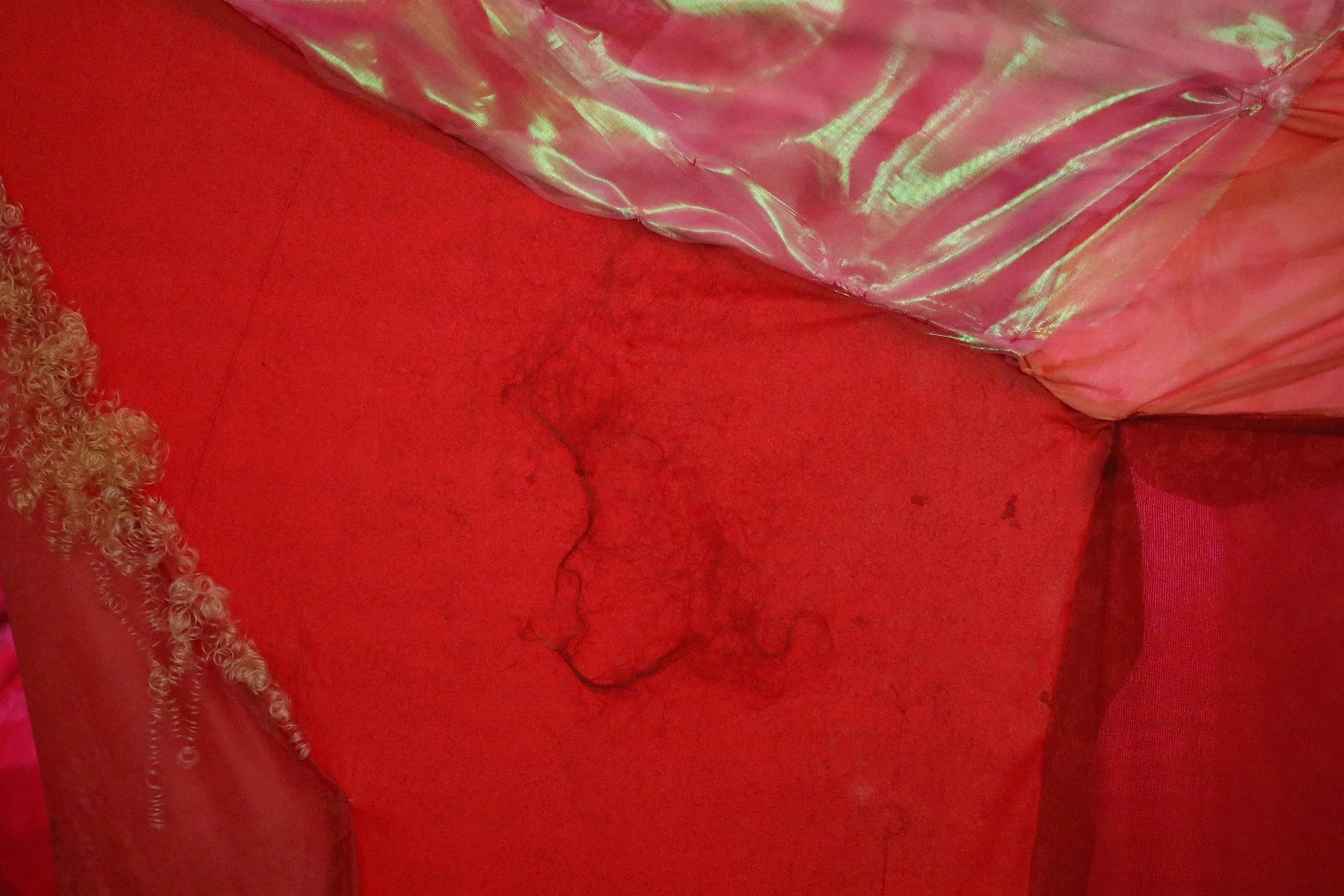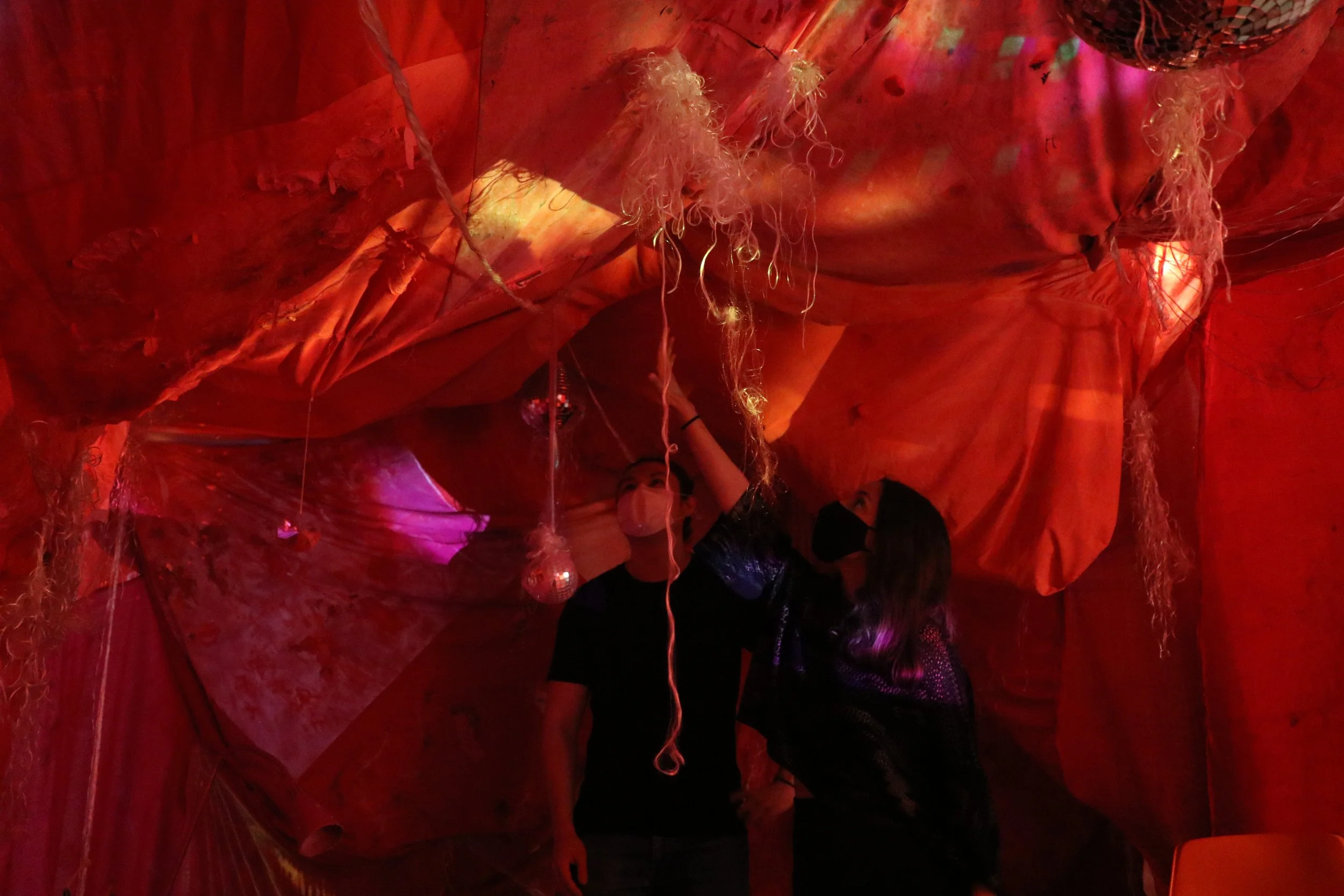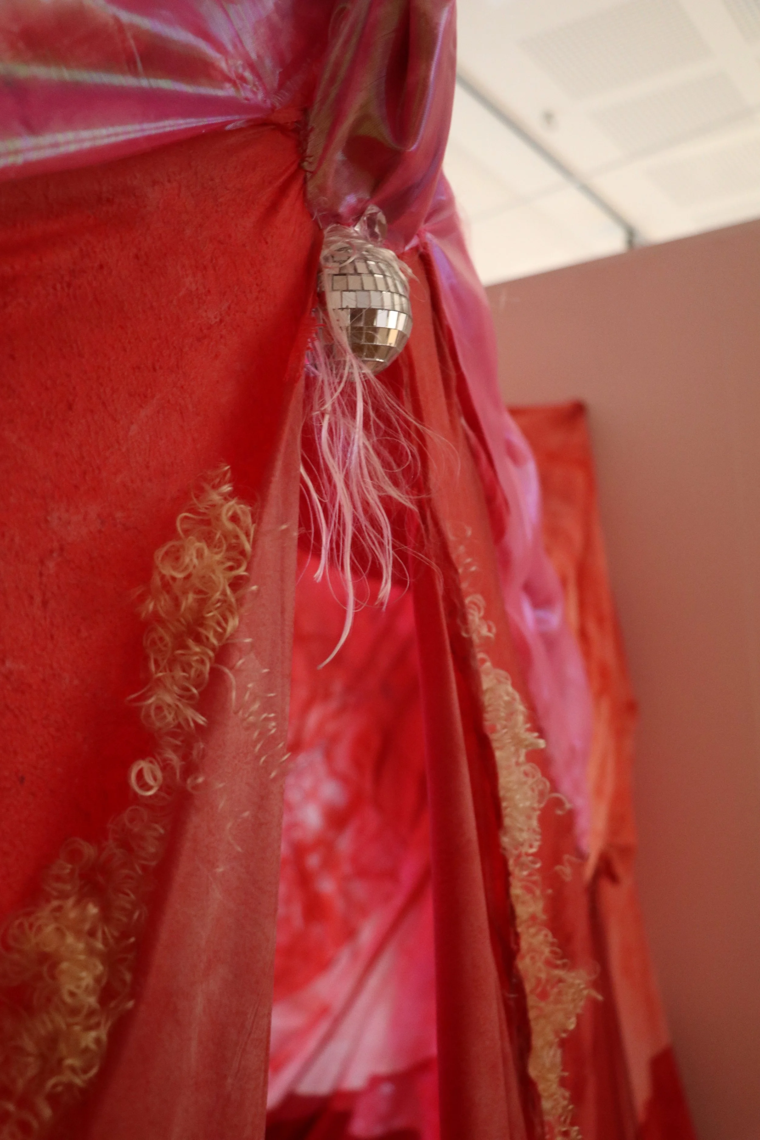 Fetus Dance Party in the Womb Room (2021) is an interactive multimedia installation that combines video, sound, light, textiles and mixed media. The installation presents the womb as a grotesque psychedelic dreamscape, situated between the absurd realm of disco and abject experiences of womanhood. Viewers are encouraged to embrace feminist art and critique to re-imagine the representation and value of female experience for a hopeful futurity.