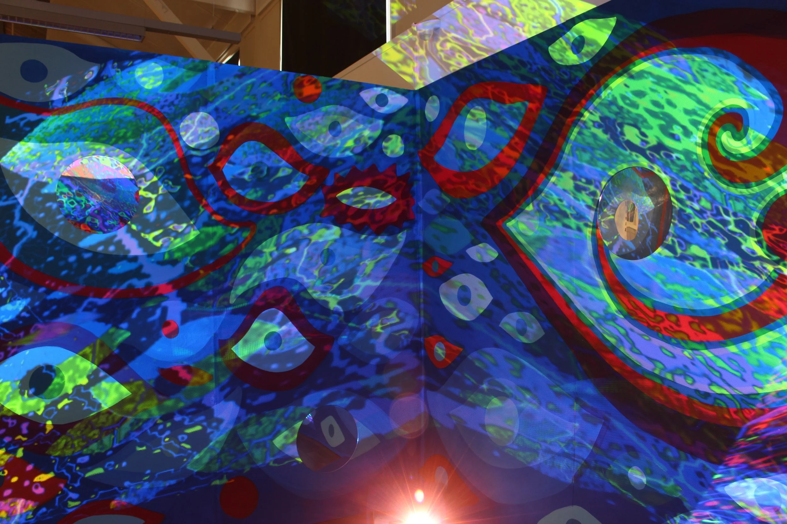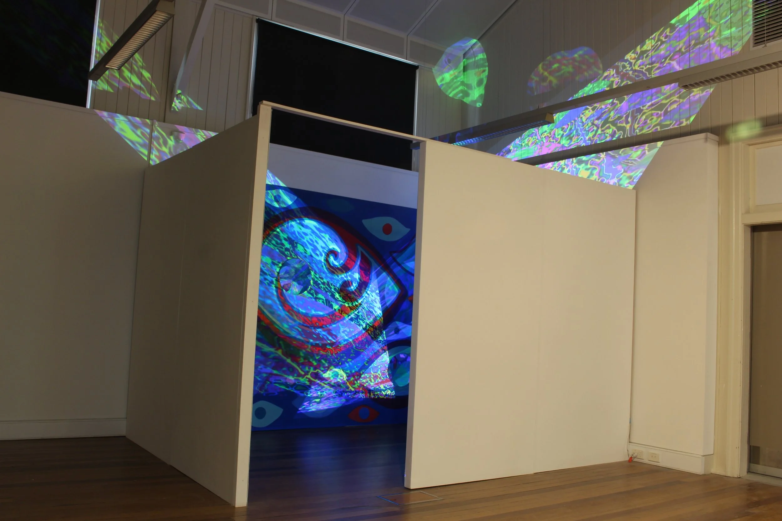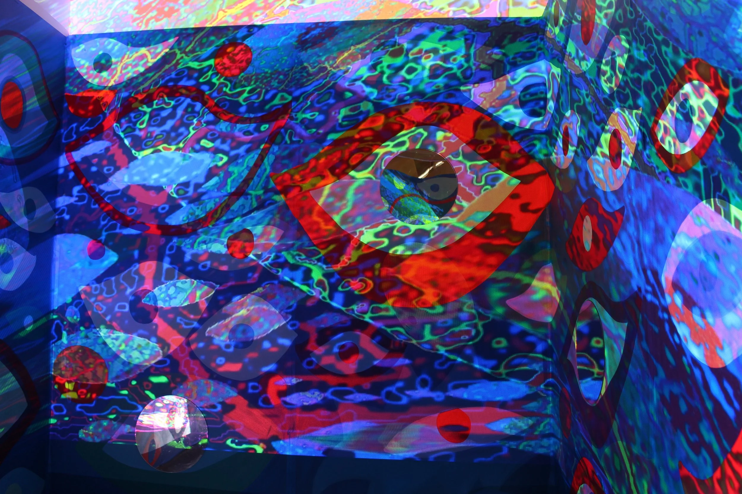 Swimming in the Universe (2021) is an immersive installation combining wall paintings, digital projections, reflective objects and a meditative soundscape. The installation offers viewers an immersive escapist environment for personal transcendence and introspection via void like imagery bathed in psychedelic colours.