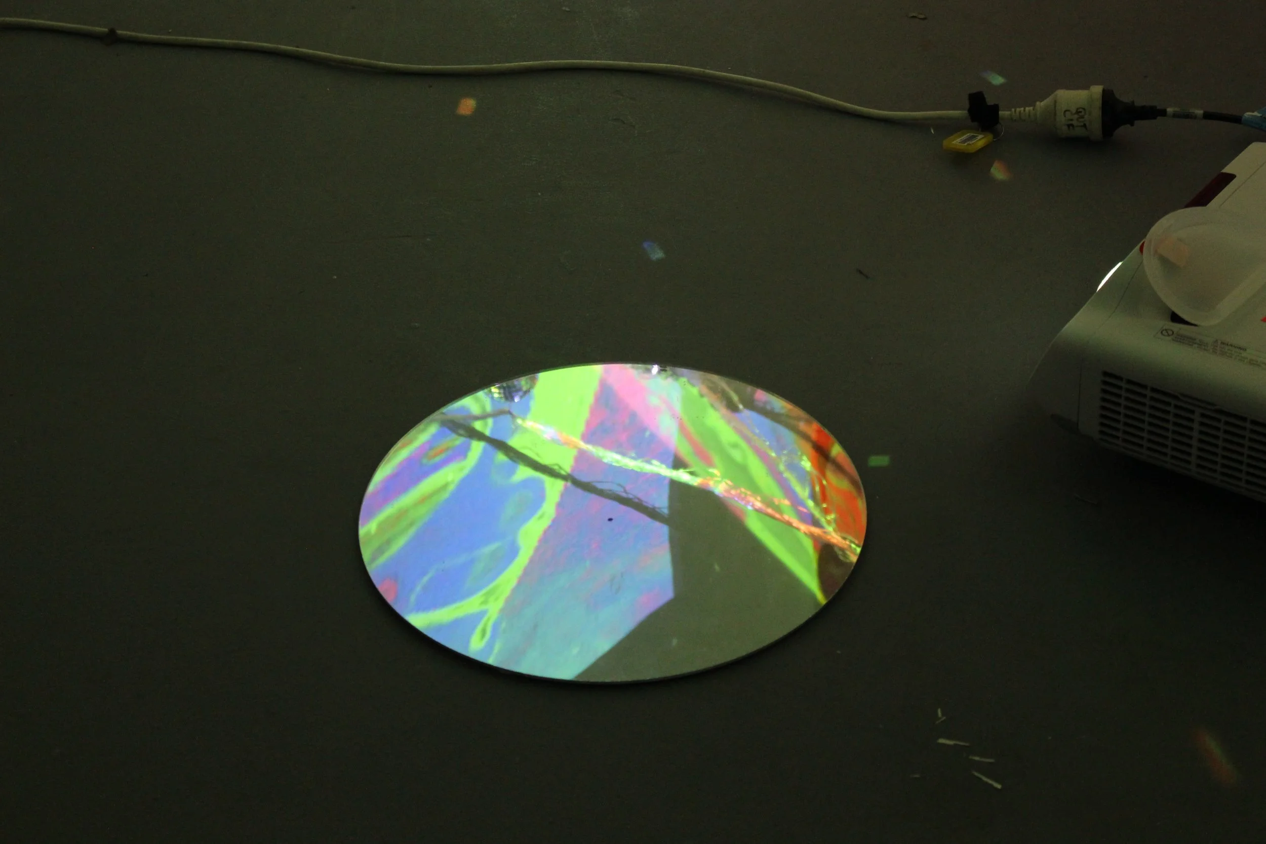 Spiritual Disco (2021) is a collaborative and experimental multimedia installation that presents a psychedelic field of eyes forms projected over an acrylic painting, framed prints, found objects and the body. Disco balls, CDs and crystals activate an ethereal presence of light, saturated in contrasting colours that present an optical experience of the spiritual via a disco subcultural lens.