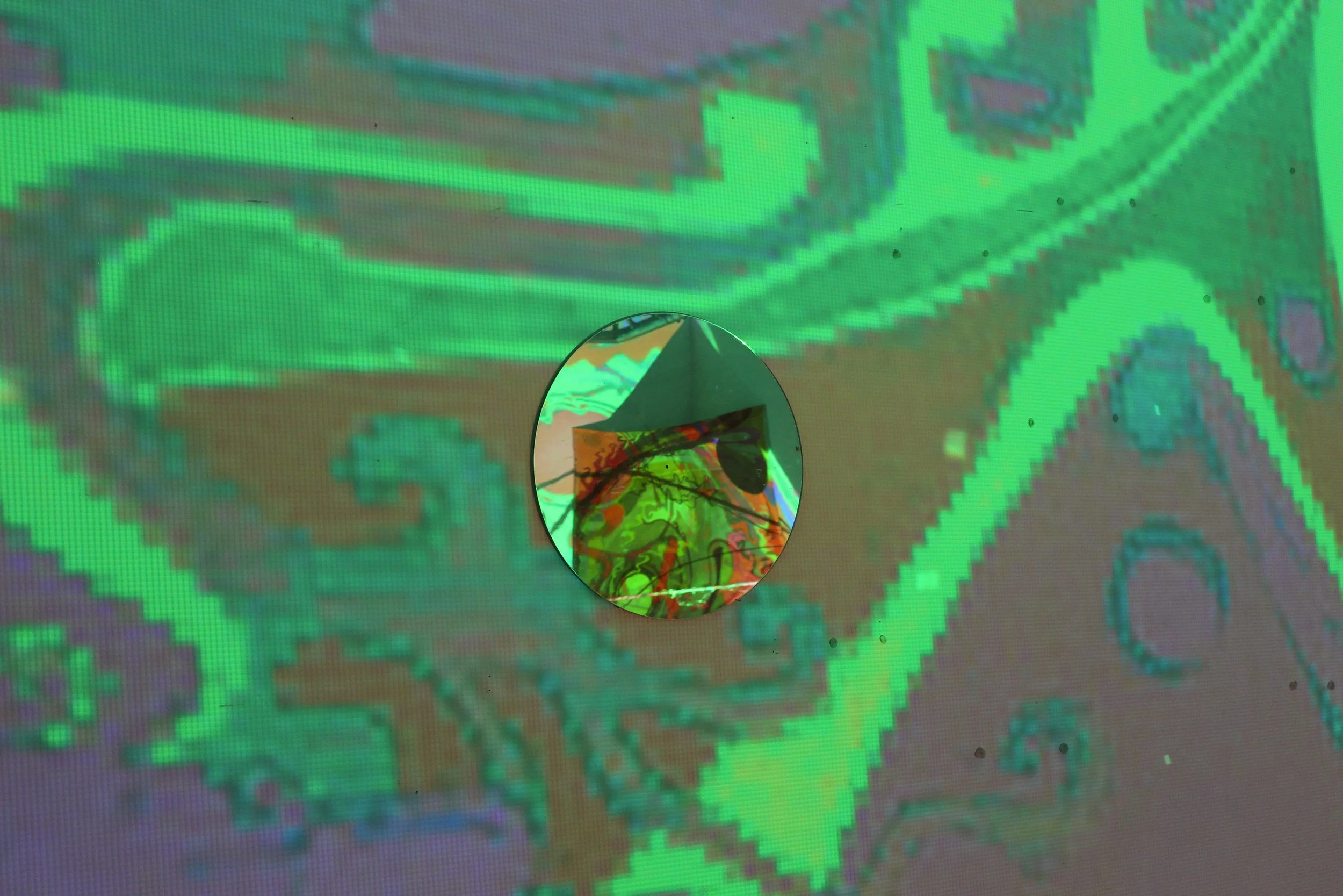 Divination Circle (2021) invites the viewer to bathe themselves in the rainbow coloured light of a circular projected eye scan. Accompanied by meditative audio, the installation is a form of escapism for personal transcendence via the healing qualities of colour therapy and the infinite flow of circular symbolism.
