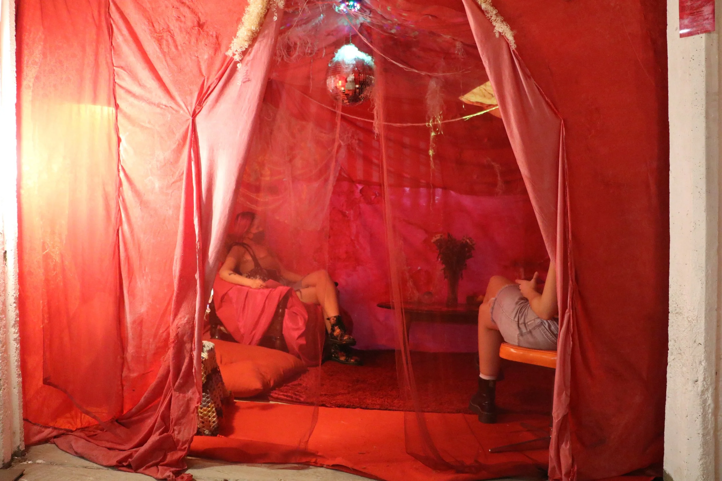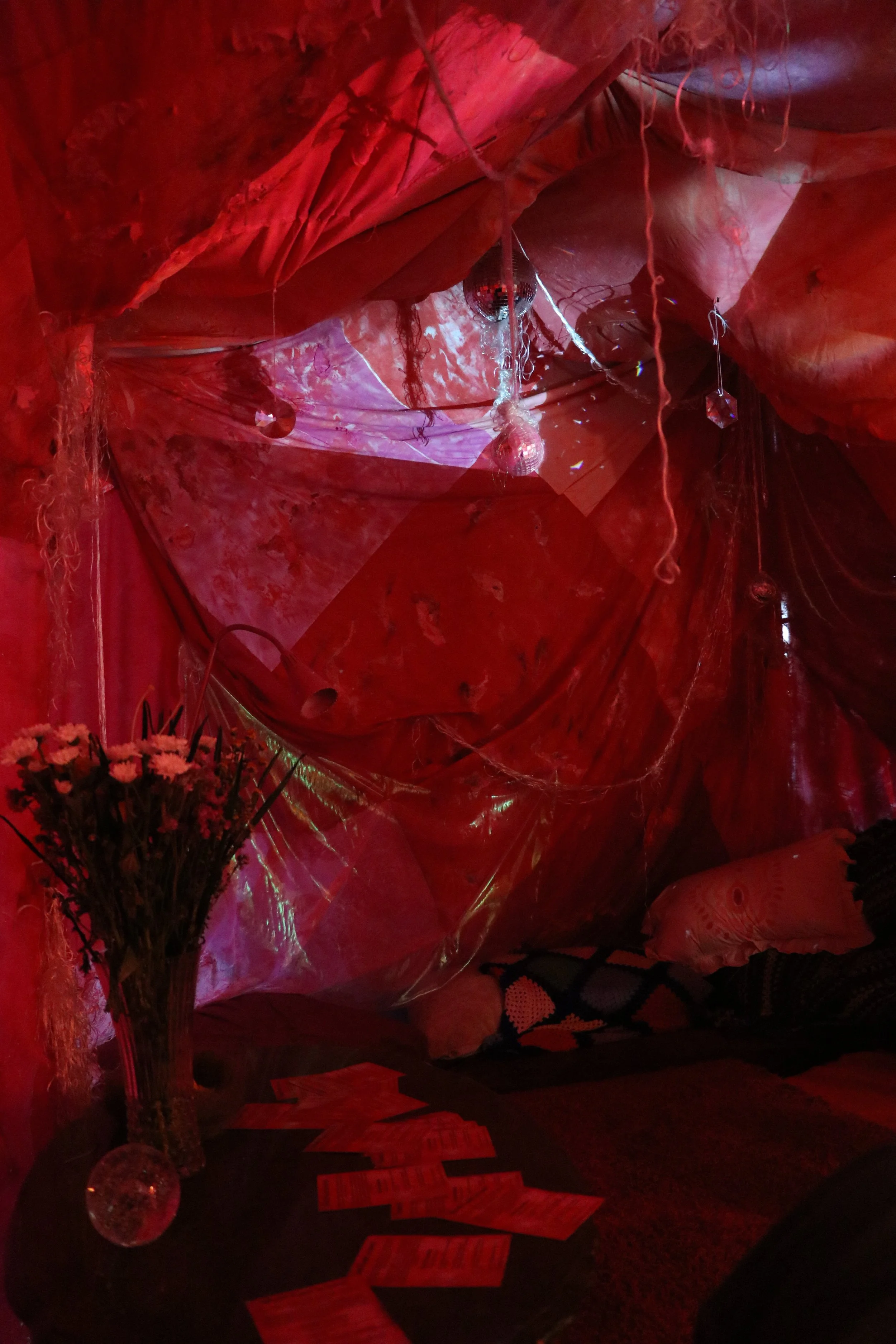 Womb Room (a home) (2021) invites participants to escape into a psychedelic dreamscape that presents itself as a utopian home. The womb plays the role of a universal mother that aims to nurture, nourish, comfort, protect and reconnect you to the concept of home within yourself and your environment through sensory experience. So sit back, relax, touch, smell, listen, visualize and meditate on reconnecting to home as long as you need so you can feel at home wherever you may be.